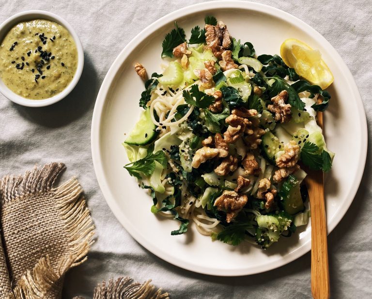 4. When the noodles are cooked, place them in the bowl with the veggies, pour the dressing over and top with nuts, seeds and fresh herbs.